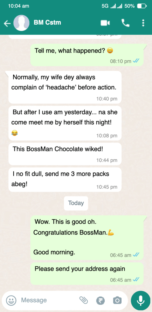 Get your BossMan Herbal Chocolate today, and save yourself bedroom embarassment and pain of “breakfast”.
